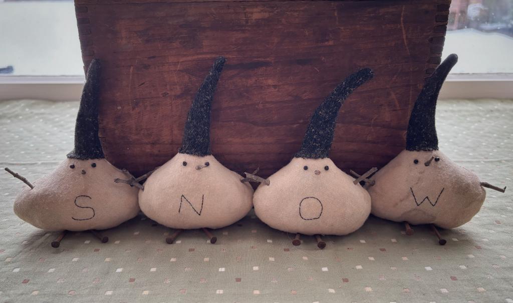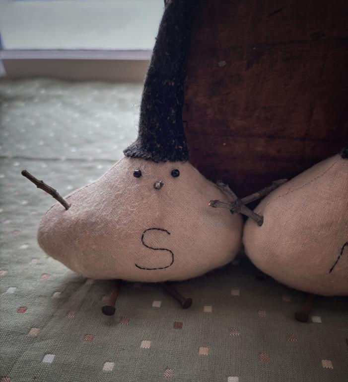 Sold. These adorable little “snowballs” are rag stuffed and measure about 4x5”. They have wool hats and real sticks for their arms and noses. Please email me to purchase amijones.folkart@gmail.com