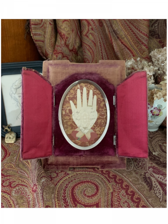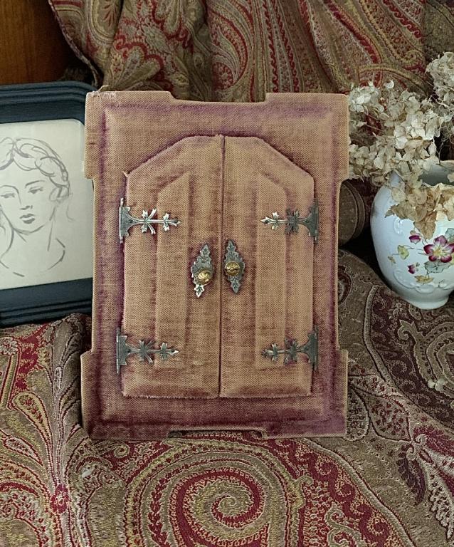 This late 1800s frame has lost most of the velvet, but when you open the doors, you can still see the lovely fuchsia color.
