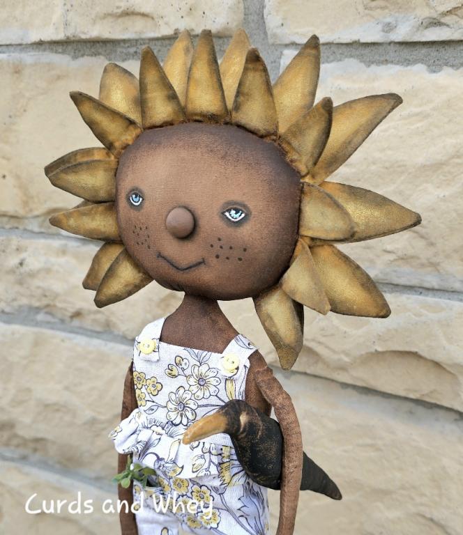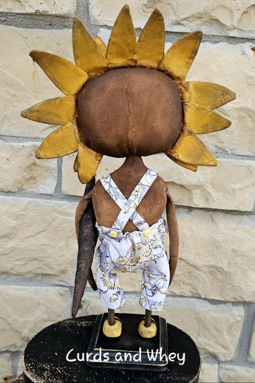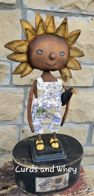 Abilene is a wonderful Sunflower-head girl. She stands 15" tall and is dressed in the cutest lil pair of overalls with the ruffle in front. Her little pocket is filled with greens she picked when she was out in the garden. Old Crow loves his Abilene and travels everywhere with her. (sorry, the box Abilene is standing on is not included) *Click the photo for additional views*