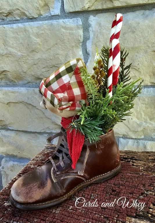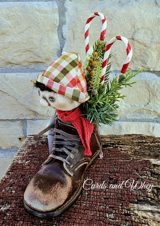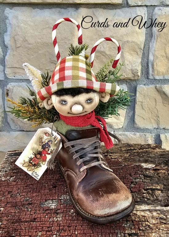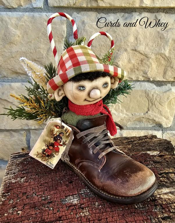 Alfie is such a mischievous little fella! He has made a home in a well-worn boot, surrounded by vintage candy canes, luscious greens and a bottle brush tree. A sweet little hang tag is attached to his green fleece sweater. *Be sure to click the photo for additional views*