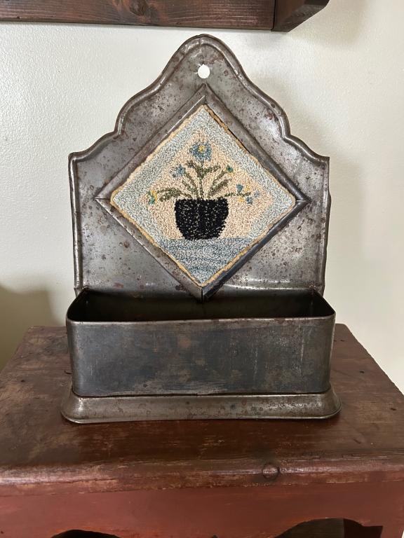 This is an antique shaving wall pocket I’m told ….I added a floral punch needle I designed to the center where a mirror use to be… this piece is old and has a lot age, but would look adorable displayed in any room, bathroom included…. It measures appropriately 11” x 9” …