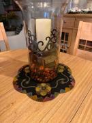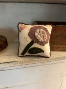 Last but not least another smaller flower wool pincushion. The soft pink die cut wool flower, with a small round orange wool circle and small pink center all on a purple wool pincushion. The backing is a pretty print fabric. I’ve added lots of fun stitches with Sue Spargo’s threads and stuffed it tight with crushed walnut shells and some premium polyfil. It measures 3 3/4” x 3 1/2” , is about 1 1/2” thick and weighs 4.5 ounces. If you have any questions please ask. They are all are one of a kind. Kindly asking $48 which will include shipping. Thank you so much for looking.