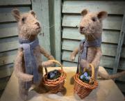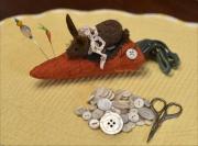 Check out this dapper bunny!! I absolutely loved creating this sweet guy using a pattern by the Spotted Hare! His carrot is made from wool and stuffed with sawdust to keep your pins sharp. The bunny is made from a beautiful chocolate mohair fabric and stuffed with wool scraps. I created a glass pin just for him and added a tiny carrot pin by Pink Dragonfly Crafts. I also added a few black steel head pins and a mother of pearl button. Check out his wool fluffy tail! He is approximately 6” long, not including the greens on the carrot. Kindly asking $88.00 and $10 for travel care. As always please keep away from children and pets.