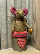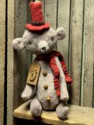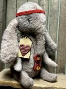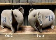 I’ve stitched this prim elephant from my own hand dyed plush felt, and aged him nice and dark for a perfect old time appearance. He has beaded eyes and a stitched mouth. His legs are stitched in place and he has thread jointed arms. He has an aged stamped clay heart tag dangling down one side and a head band with wool quillie. I've stitched wool pennies and rusty bells on his tummy. He's just precious. He will come signed and dated. He‘s just under 11 inches tall as he sits. Created with many loving stitches in my smoke free home, a Sassafras Hill original. *$54.00 plus $7.50 postage in the USA*