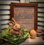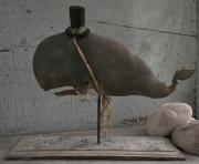 This dapper whale is hand painted. He has glass bead eyes and teeth. His top hat is spun cotton. He is smoking a clay pipe. The pipe can be removed. His base is also hand painted. The base is 11 3/4" x 3 3/4". Whale is approx. 10" long and 9 1/2" tall from base to top of hat. $139.00 + shipping.