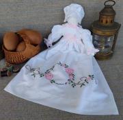 "SHEILA" is an incredibly sweet little Church Doll. Many years ago, little girls kept quiet in church by playing with their "church doll". SHEILA is 23 tall by 8 inches wide. Her skirt is made from a pillowcase that has been embroidered with pretty pink roses. She also has a cute little bonnet tied with pink ribbon. Handmade by me but NOT tea stained yet. SHEILA looks so pretty in her pure white dress I really just hated to PRIM her up. If she doesn't sell as she is, I'll consider PRIMMING her. But for now, crisp white!. Kindly asking $79.00, with additional shipping of $7.95. Email me at VG004@COMCAST.NET to arrange payment for your purchase. I accept PayPal and Personal Checks. Thanks so much for shopping with our group!