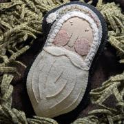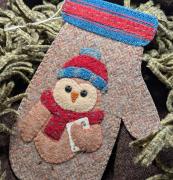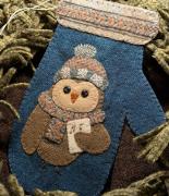Cute little Gertie Owl is holding her caroling music all dressed up in her favorite beanie and scarf. This mitten ornament is appliqued in wool using over-dyed cotton flosses and button eyes. Background wool is a beautiful over-dyed textured tan to make this a one of a kind 5" x 7" hand stitched heirloom ornament. Backing fabric is a wonderful homespun cotton. Design by Little Red Hen and lovingly stitched by me.