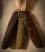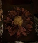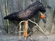 I made this crow with various black wools hooked and backed with black wool added an antique shoe button for eye…hanging from beak is a paper mache orange pumpkin….crow is sitting on an antique thread spool….