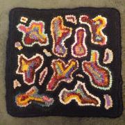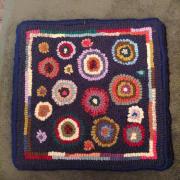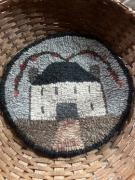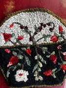 A 9” round basket mat with little florals I hooked using variegated black wools for background ..I added wool ruching for trim around edge…this piece would look adorable displayed on a covered porch on a stand or trunk or chair mat…can be displayed on a counter stand or added to a front of a wicker basket or wreath even….