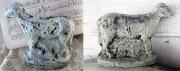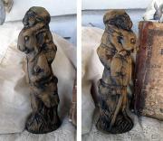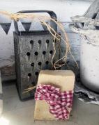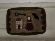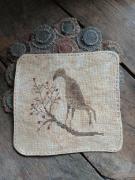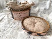 This 3 1/2" x 4 1/2" paper mache oval box has been covered with very antique looking papers.I hand stamped the fabric ( Osnaburg ) in the pin cushion lid, using 3 stamps and 3 shades of brown archival ink. I sewed up a little bird and added Prairie grass.