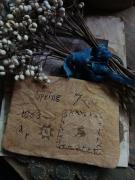 Happy Spring! Up for your consideration is a sweet 'Spring Tyme' flat primitive sampler... Perfect to put in an old primitive wooden bowl or lay on an old primitive table... Measures approx 5" x 6 3 /4" ... Backed in the sweetest reproduction brown and blue fabric... Stitched on linen, antiqued, and wrinkled for an aged look.. Email jltg5@aol.com if interested... $55 w/travel fare included.. Thank you for visiting!