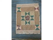 The Ohio Star block is the central medallion of this doll quilt with an hourglass block in each corner. 10 x 13 inches. The quilt is sewn together by machine but all the visible stitching which is the quilting and binding is done by hand with cotton thread. The fabrics sat in a coffee dye bath awhile so variation of shade shows across the quilt. Kindly asking $85.00 which includes shipping.