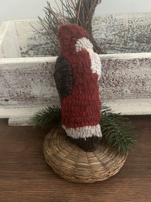 I hooked this Belsnickle Santa bowl filler …I added a backing stuffed with cotton fill…adorable place on a little basket ( basket and greenery in photo not included) or add to a basket bowl crock etc…he measures appropriately 3 1/2” x 8 1/2”