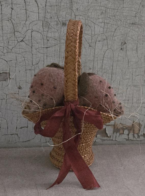 NeedfulsTwo hand painted wool berries adorned with glass beads sitting atop an antique basket. Basket is in great shape for it's age. Basket stands approx. 5 1/2" tall x 3 1/2" wide at the widest point. Sold... thank you!!