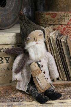 Hello and thank you for visiting my page. My November offerings include three small but sweet Santa dolls. This little guy measures just 8.5 inches tall seated. He does not sit on his own and his legs are sewn into place. His body is made from a soft, green plaid fabric. His arms are wired for posing and he has a sweet, stitched face and wool beard, brows and hair and a teensy, tiny, needle felted mouth. He has a stocking hat with a rusted bell tied to the end and a soft, lightly aged coat with wooden beads serving as buttons. His boots are painted on and he has an aged scarf and he comes with a teeny, tiny doll. The little baby doll measures only about three inches long with a stitched face and a sweet, little dress and apron with wool hair. The Santa doll will come with a signed and dated tag. **** If you would like to purchase this sweet Santa, please send me an email at buttonboxmerc@yahoo.com and let me know that you'd like Santa #3 I accept PayPal as payment so please include your PayPal email address as well as your zip code so I can figure the shipping. Thank you so much for stopping by. Wishing you all a very Happy Thanksgiving and I'll "see" you again in December! Santa #3 is $65 plus shipping