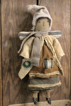 This lovely, winter angel is made to hang but she can sit, though not on her own. She measures just 13 inches long. She has the sweetest, little stitched face with a wisp of wool hair peeking out from under her soft, winter hat. Her arms are wired for posing as well as her hat. She wears a nice, aged batting coat with a warm scarf, knit leggings and a long skirt and apron. Her little shoes are painted on and she has wooden beads sewn to her coat, serving as buttons. She has striped wings with aged batting backing. She's carrying the cutest, tiny wreath and you can leave her out all winter long. The Winter Angel will come signed and dated. If you would like to purchase her, please send me an email at buttonboxmerc@yahoo.com. I accept PayPal as payment so please include your email address that you use for your PayPal as well as your zip code so I can figure your shipping. This tiny but sweet, Winter Angel is $53.00 plus shipping. Thank you so much for stopping by and have a very Happy Thanksgiving!