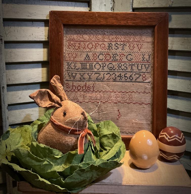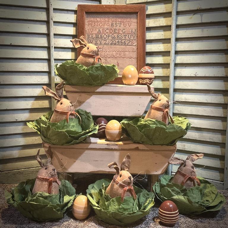 Just in time for your Spring and Summer decor, I have made 6 Cabbage Bunnies. Each bunny is made from linen that has been grunged and distressed for a nice primitive look. Eyes are made with tiny glass beads. I have added a little scarf made with burnt orange velvet. The bunnies are nested in their cabbages. Each cabbage is made from 12 leaves that have been painted, grunged and sanded. They are formed into a perfect little cabbage for their bunnies to nestle in. They measure 7 inches tall and 7 inches wide. Pattern is from Rock River Stitches. I have 6 to offer, each sold separately. Shipping is included in the price. ALL SOLD THANK YOU!!