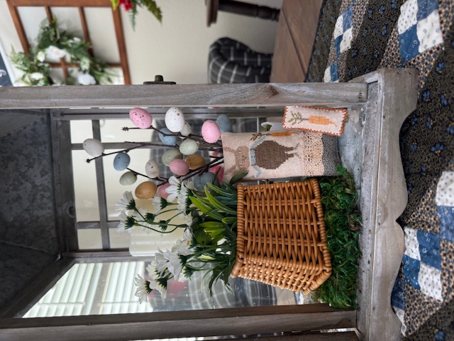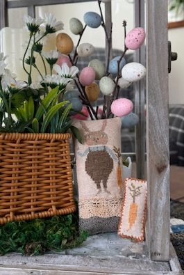Carrot top is a two piece cross stitch collection designed by Notforgotten Farm. They are cross stitched on linen using 1 strand of floss over 2 linen threads. I made them into 2 miniature pillows which are darling displayed in a lantern or bowl. They measure 5” x 2 1/2” and 2” x 1”. Many hours go into stitching these 2 miniatures. If you would like to purchase both for $100, email lori@lilyannastitches.com to make payment arrangements.