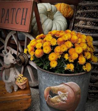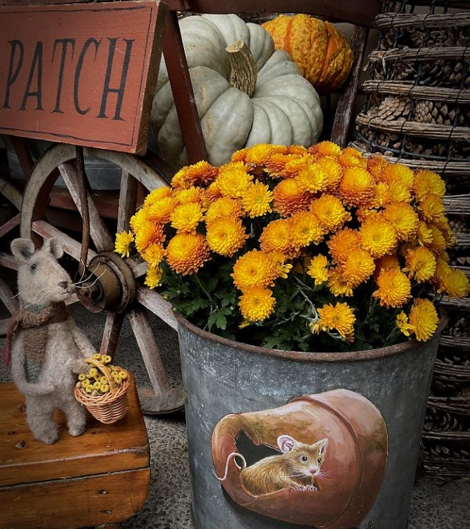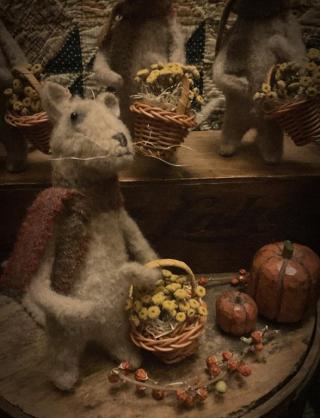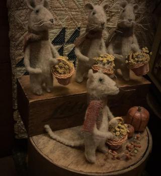 Chesterfield mouse is one of my favorite patterns to make. These little guys have so much character. They are made with plush fabric. They have been firmly filled with wool. They have sweet little black bead eyes. Scarves of felted wool and each Chesterfield holds a basket filled with dried yarrow. Pattern is from Cinnamon Creek Folk Art. Shipping is included in the price. I have 4 to offer, each sold separately. 1 sold