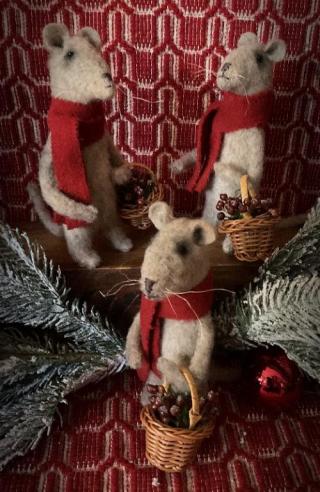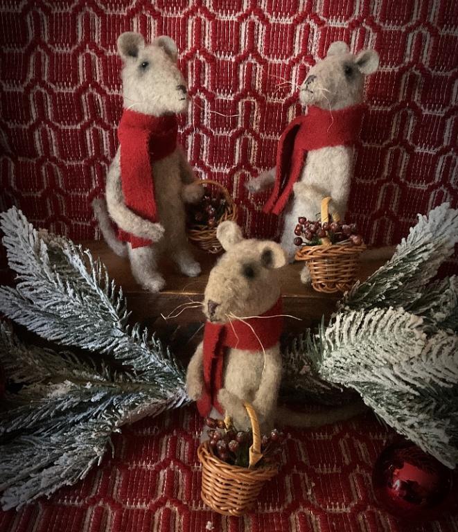 Chesterfield mouse is one of my favorite patterns to make. These little guys have so much character. They are made with plush fabric. They have been firmly filled with wool. They have sweet little black bead eyes. Scarves of felted wool and each Chesterfield holds a basket filled with dried rose hips. I have added some german glass glitter for a little sparkle. Perfect for you Christmas Decor. Pattern is from Cinnamon Creek Folk Art. Shipping is included in the price. I have 3 to offer, each sold separately. 1 SOLD