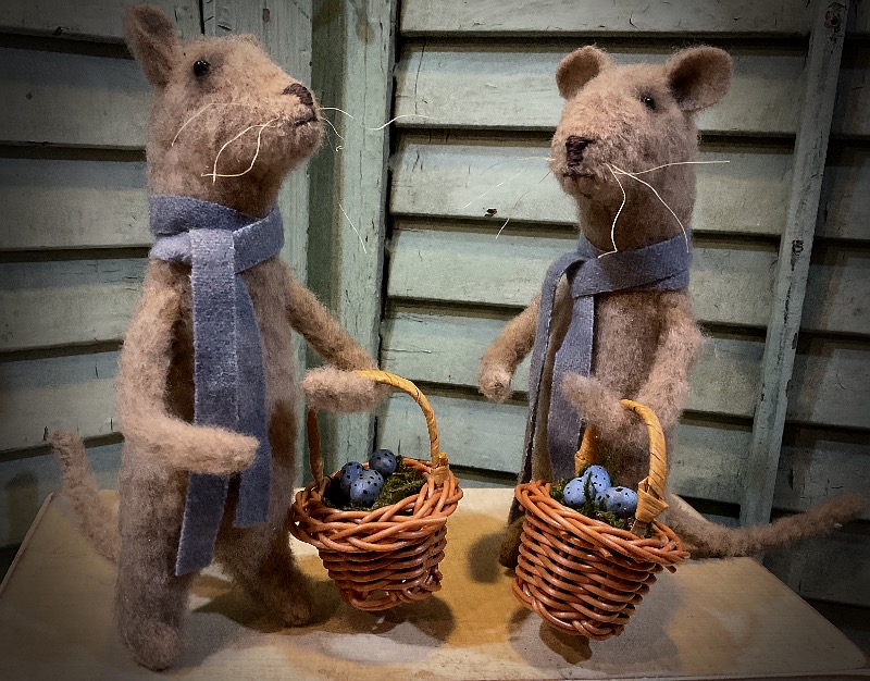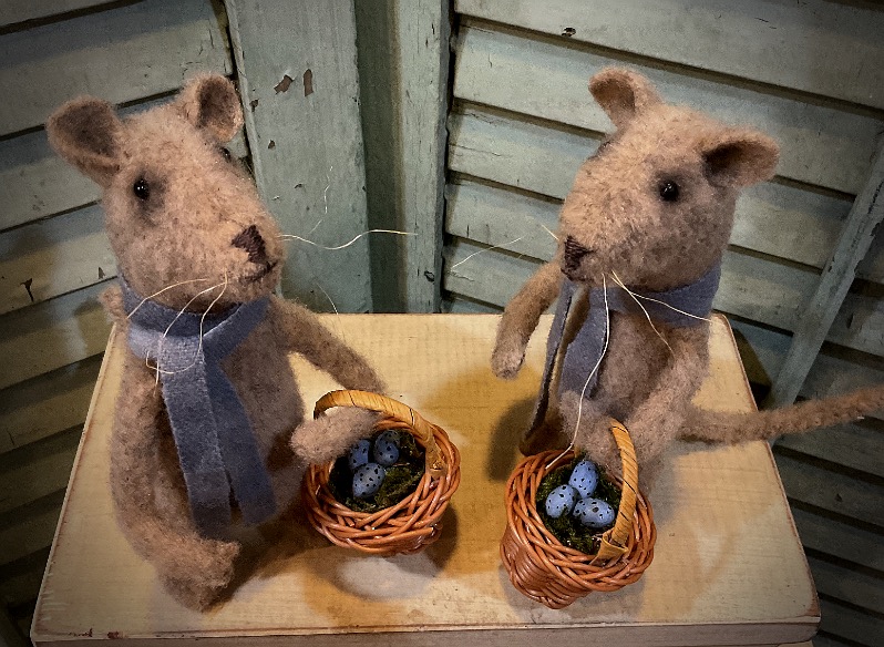 Looks like these two have been looking for eggs! Each Chesterfield Mouse is made from plush fabric. Their faces are embroidered with added glass beads for their eyes. Chesterfield has a blue scarf made from felted wool. They each have a basket where they have gathered their eggs. I have made the eggs from paper clay, painted and antiqued. Chesterfield has wire in his tail so he stands perfectly. His arms are also bendable. They each measure 7 inches tall. Pattern is from Cinnamon Creek Folk Art. Shipping is included in the price. SOLD THANK YOU!!