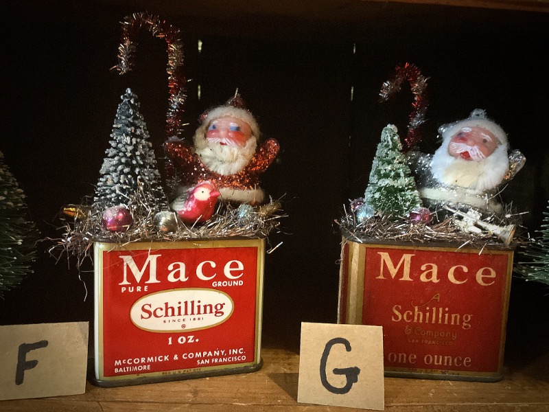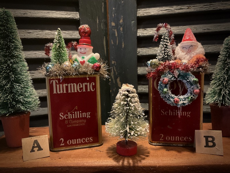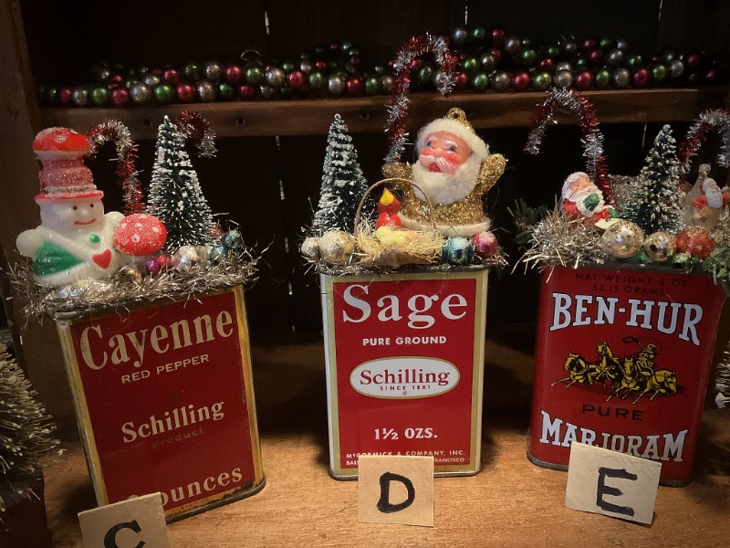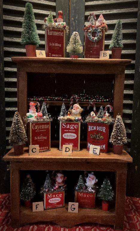 All year long I have been collecting vintage spice tins and vintage tiny Christmas decorations. Each tin is securely topped with many vintage pieces, I have added little trees, and German glass glitter. The tins measure between 7 and 5 inches tall. A perfect addition to your primitive kitchen. Guaranteed to put a sweet smile on your face. I have seven to offer, each with a letter beside them a-g. Each sold separately.