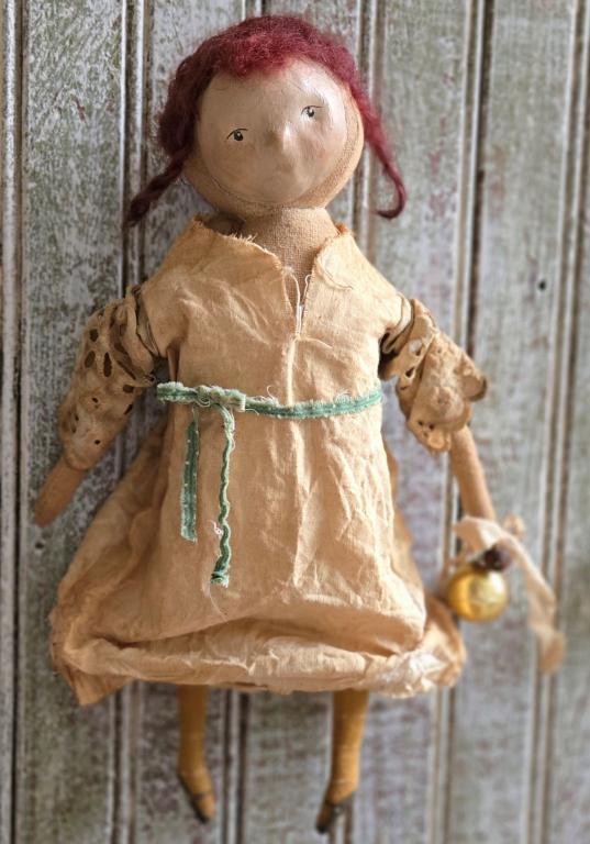 Cloe is has a paper clay face, wool hair and painted features. She is holding an antique Christmas bobble. Cloe is approx. 11" x 6" She would like to spend Christmas at your home!! $95.00 + shipping.