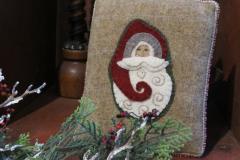 ***CLICK ON IMAGE TO SEE ANOTHER IMAGE***...I am offering this sweet wool, appliqued Santa face pillow. All parts are made with 100% wool and the facial features are sewn using DMC thread. There is also an edging that is made of two kinds of trim.....a beige/cream patterned twill tape, used with a peppermint style chenille yarn. This really dresses up the edge without getting too fussy. This small pillow measures about 7"H x 5 3/4"W and is stuffed with a lightweight natural cotton batting. I am kindly asking 69.00 plus postage. Please email mommadonnatx@gmail.com to make a purchase. I gladly accept paypal. Thank you so very much for your visit today to PHM! I hope you have a joyous holiday season!
