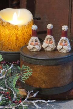 These Santas can sit or be used as an ornament on a tree or wreath.....each sold separately. Each ornament, though all slightly different, are about 2 1/2" tall. There is a hanger, with a gold string attached, for hanging on a tree or wreath, but the ornament can also stand upright on its base. These are all hand sculpted by me, originally in a polymer clay and then molded into a pecan shell resin and hand painted.....a lot of steps were involved in making these ornaments! A light coating of antiquing glaze is applied to enhance the texture in the face and beard. I am kindly asking 16.00 for each, plus postage for a mailing envelope. I gladly accept paypal.....please email mommadonnatx@gmail.com to make a purchase. Thanks for your visit today! I hope you enjoyed looking at all the creations offered by the artists here at PHM! ***Note...If you look closely, there is a reference written on the bottom side of the ornament to Isaiah 64:8..."Lord, we are the clay, you are the Potter. We are all the works of thy hands".
