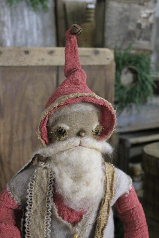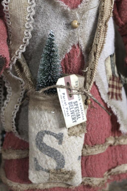 He wears an oversized pair of pants, a jacket with aged trim and a soft vest tied closed with a wooden bead. His hat has a teeny bell attached to the end and he has a sack from antique grain sack with aged trim, a bottle brush tree and a teeny, wrapped present with a Christmas tag.