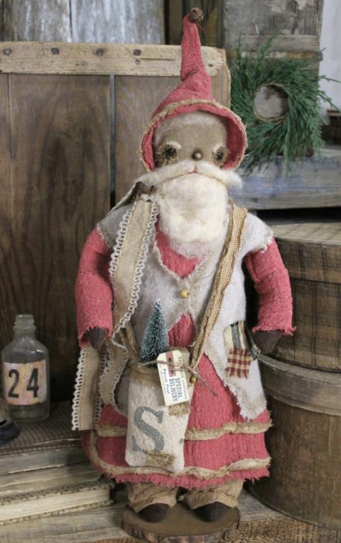 He wears an oversized pair of pants, a jacket with aged trim and a soft vest tied closed with a wooden bead. He has brown "laced" boots, is hat has a teeny bell attached to the end and he has a sack from antique grain sack with aged trim, a bottle brush tree and a teeny, wrapped present with a Christmas tag.