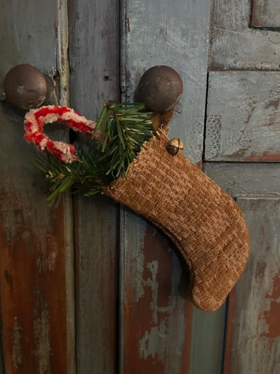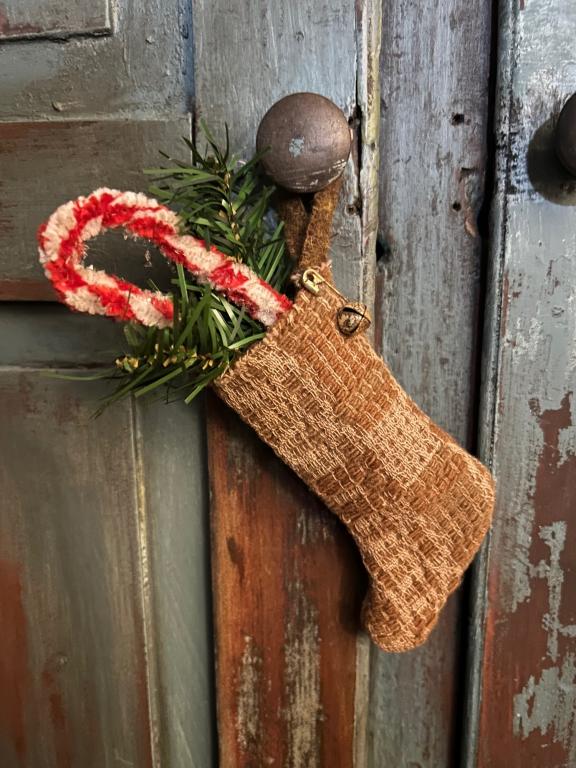 I made these out of a piece of antique coverlet…a mustard colored I aged with walnut stain. I added a candy cane to each that I made with pipe cleaners and added added diamond dust …the stockings I added a rusty pin and bell..these two measure approximately 2 1/2” x 5” …