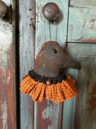 ~Sold~ Sweet crow bowl filler or hanging ….I made using painted stained sanded muslin, added primitive orange homespun for dress one with orange chenille one with black Pom Pom trim…added rusty pins buttons bells….dried bean for eye 2 available Thank you for visiting