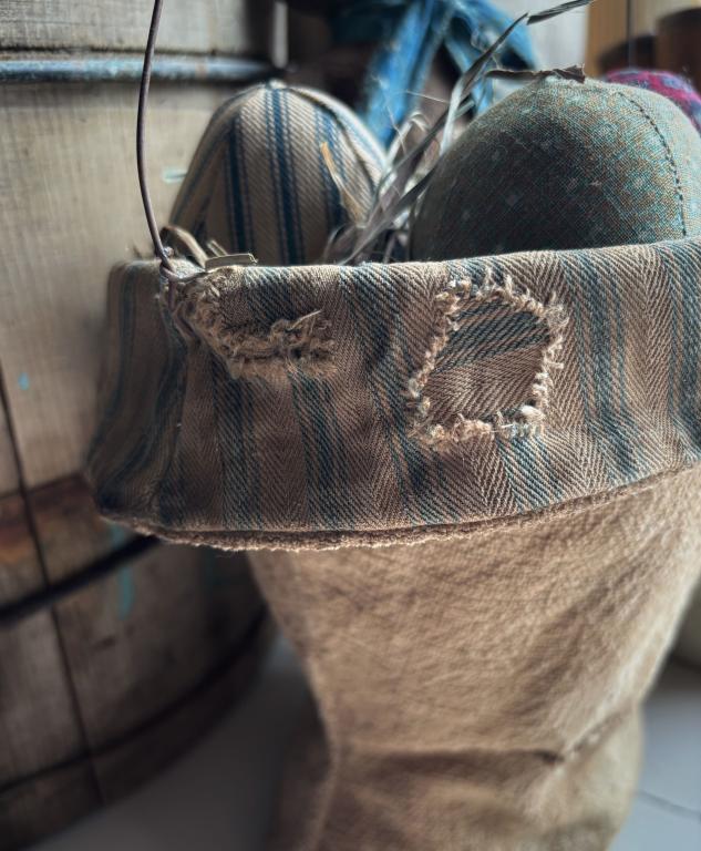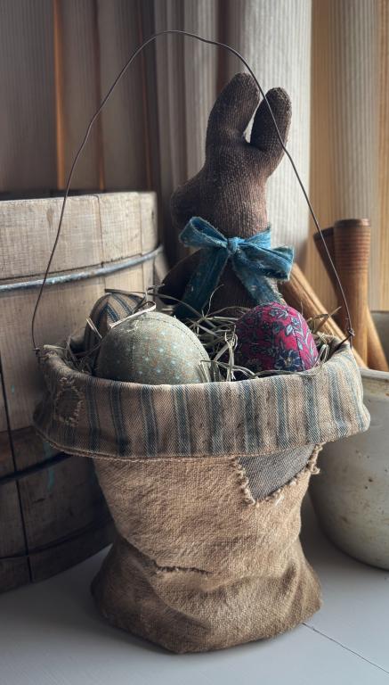 The basket is made from an old grain sack and lined with old blue and white ticking. It measures 14” in total. The “chocolate” bunny is made from old grain sack fabric as well. He measures 9” tall. The eggs are made from various antique fabrics and measure 3” long. The basket is filled with dried grass. Everything is removable. Please email to purchase amijones.folkart@gmail.com