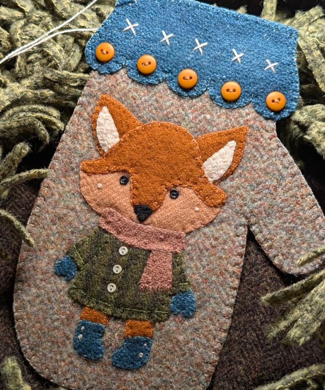 Cute little Felicity Fox is all dressed up in her favorite coat and scarf. This mitten ornament is appliqued in wool using over-dyed cotton flosses and button eyes. Background wool is a beautiful over-dyed textured tan herringbone to highlight this one of a kind 5" x 7" hand stitched heirloom ornament. Backing fabric is a wonderful flannel cotton. Design by Little Red Hen and lovingly stitched by me.