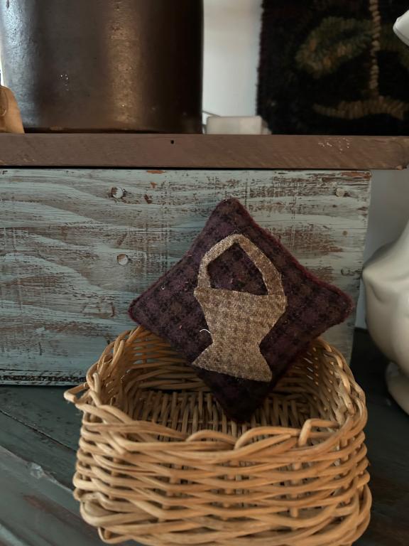 AppliqueNeedfulsFlower pillow tuck I appliquéd …this would look nice displayed in wooden bowl, basket a small crock etc…this piece measures approximately 4” x 4” …. I added wool to backing and appliquéd a basket…. $18.00