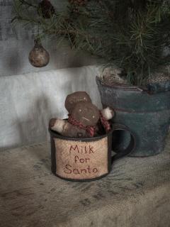 The set features 2 little ginger bread cookies inside of a vintage tine cup with a hand stitched label. The tin cup measures about 4x5”.