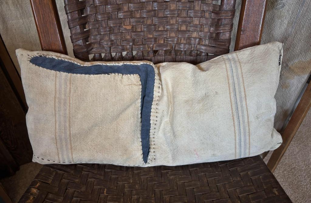 Made from an antique grain sack that shows its original patches and repairs. Rag stuffed and measures 7”x18”. Please email to purchase amijones.folkart@gmail.com $25.00