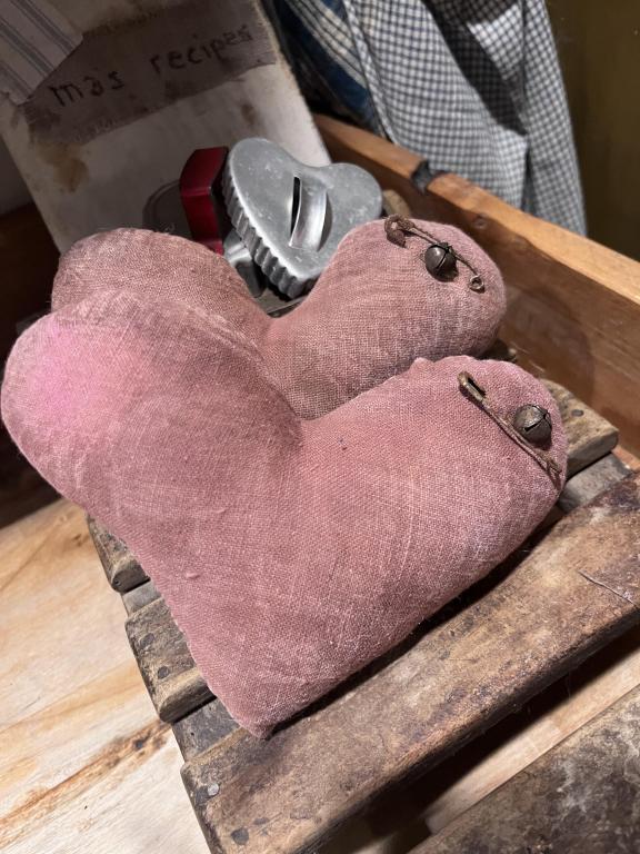 2 handmade feedsack hearts with rusty pin and a prim arrow. Sold separate, 1 heart and arrow per order. These are rag stuffed and approx 5 inches. Perfect bowl filler or shelf sitter! Price includes travel !! TONIGHTS KEY WORD FOR GIVEAWAY IS: ^^Handmades^^