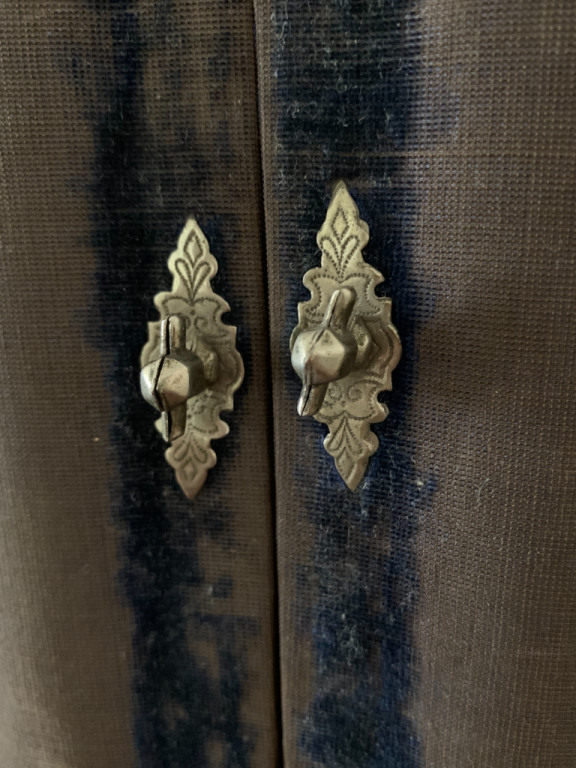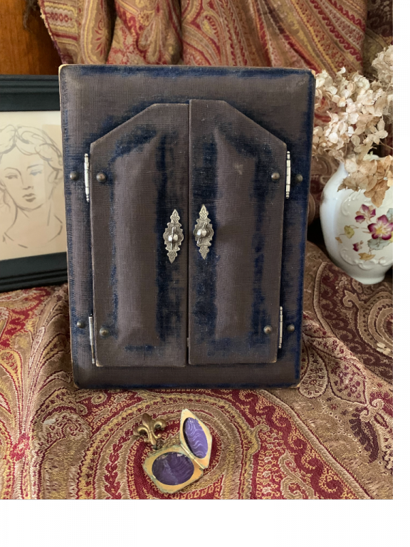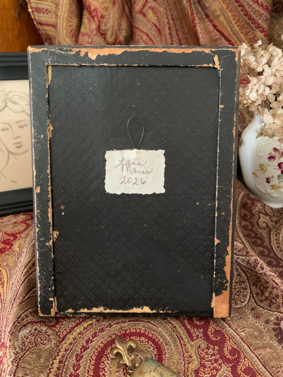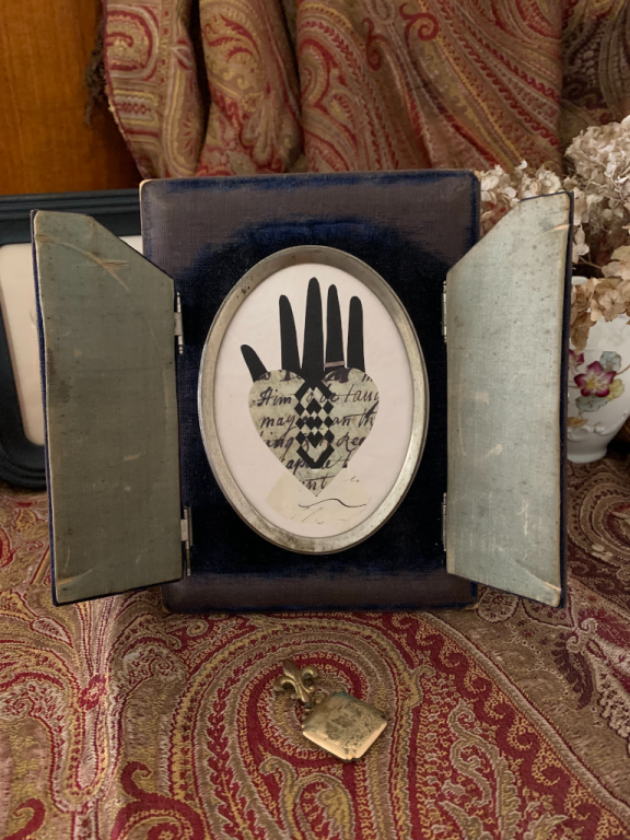 {click on the item photo to see more} This artwork is handmade, hand cut, and hand woven using a variety of old papers. The background paper is the original white moire textured paper that was in the frame. The hand is cut from paper that I salvaged off the back of an old art print. The ring is a snippet of tarnished silver metallic paper that came from a 1930s Christmas card. I used a copy of a 1700s indentured servant letter for the heart. An 1800s French document was used for the cuff. This late 1800s frame has lost most of the velvet, but when you open the doors, you can still see the lovely deep blue color. The wire easel was missing from the back, so I made a wire loop for hanging the love token. You could tie an antique ribbon on the loop for added decoration. This could also lean on a shelf or be placed on an easel. It is signed and dated on the back. Size: 6 1/4” x 8 1/4” Paypal accepted. Email to purchase: lanamanis@gmail.com