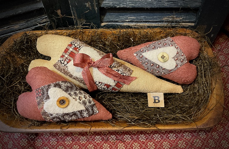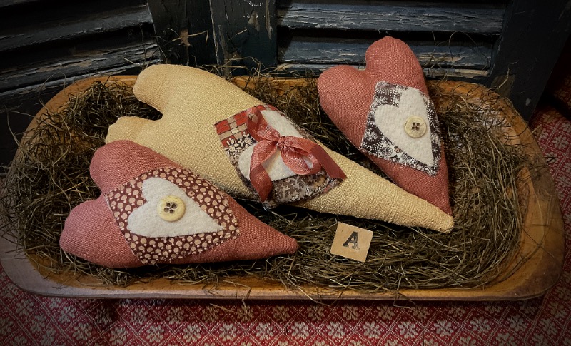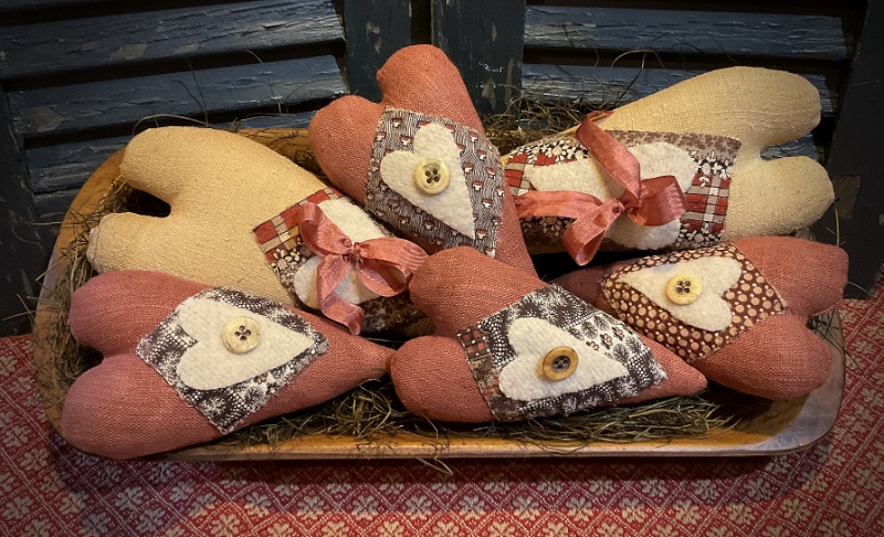 I have made two sets of Hearts and More. Wonderful pattern from Maggie Bonanomi. I have used antique French homespun for the larger hearts. BlackBerry Primitives over dyed linen for the small hearts. I have made patches with a lovely antique 1800’s quilt. Wool hearts have antique buttons attached. I have added vintage rose ribbon to the larger hearts. Each set comes with one large heart and two small hearts. Large hearts are 11 inches and the small hearts are 6 inches. They look so pretty in a wooden bowl. Lovely to enjoy year round. Two sets each sold separately. Shipping is included in the price.Set B sold