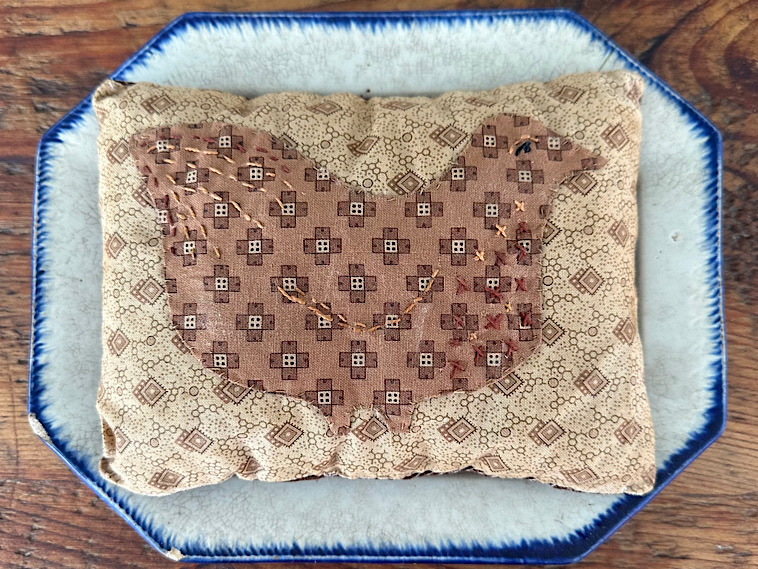 Henrietta the Hen is stitched on to a little pillow (7 x 5 inch) which could be used as a pincushion or bowl filler or to add to your primitive collection. If her stitching details are not showing well in the photos please know that she is proud of her primly stitched tail feathers and a series of "x" stitching on her chest (my primitive nod to chicken scratch stitching just for fun. Henrietta approved.) Her fabrics are reproductions from the civil war era. Stuffed with little bits of fabric scraps. Kindly asking $35 which includes shipping.