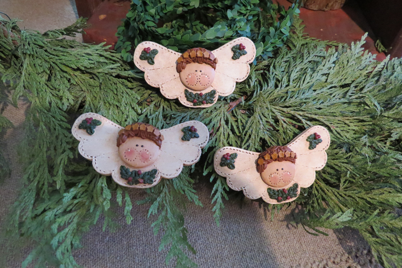 Again, I am offering my original design ornaments to appropriately fit a smaller tree/feather tree or for someone who is downsizing to smaller trees. It is hard to find primitive ornaments that are smaller and lightweight! These sweet little angel faces have stars in their halo and sprigs of holly on their wings. The ornaments measure about 3 1/4"W....they are painted in subtle colors, are gently aged and antiqued. I am kindly asking 16.00 each, plus postage for a mailing envelope. I gladly accept paypal.....please email mommadonnatx@gmail.com to make a purchase. Thank you so much for browsing my Holiday items....I pray you have a most blessed Christmas season!