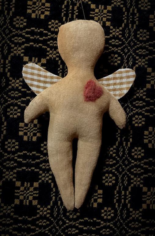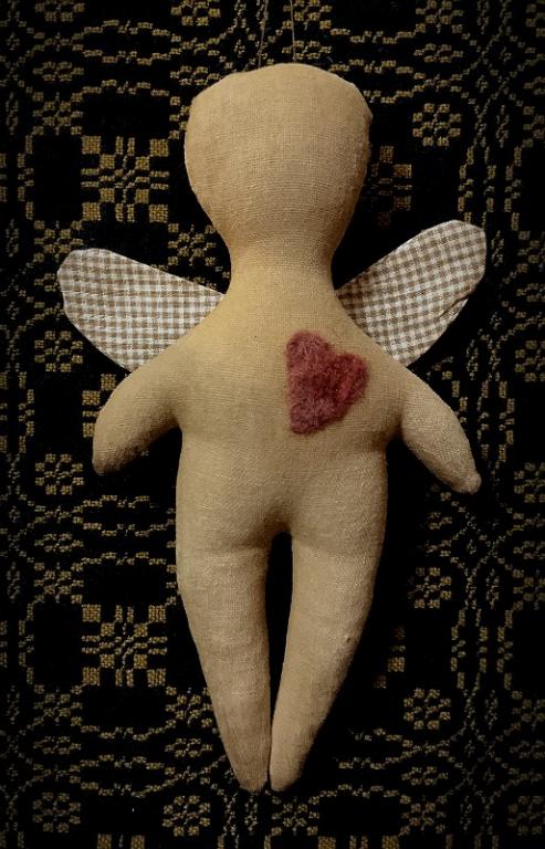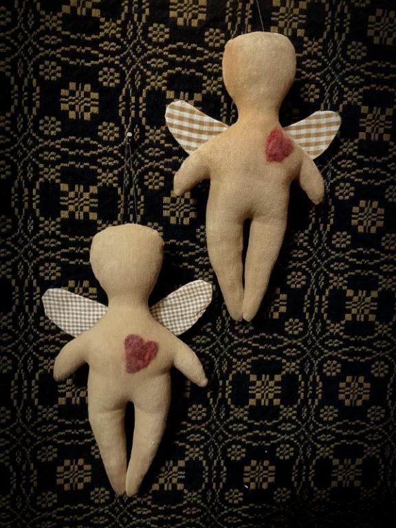 I have made two homespun Angels. Each angel is made with linen that has been distressed for a nice primitive look. They are firmly filled with poly. I have needle felted a heart on each. Their wings are made from early antique cotton fabrics. They measure 10 inches tall. I have added a waxed string for a hanger. Pattern is from The Primitive Heart. I have two to offer, each sold separately. Shipping is included in the price. 1 sold