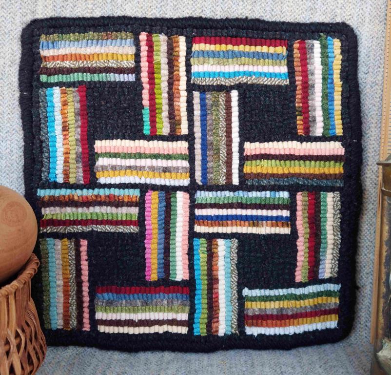 Sweet little Hooked Candle Mat #2 Braided Style Hit and Miss. Hooked by me using my hand dyed Dorr Mill wool. The cut is a #6 so it shows a lot of detail but still looks primitive enough. This little rug measures 10 inches by 10 inches square and will look so cute on your tabletop or a mantle. Kindly asking $39.00, with additional shipping of $5.95. Email me at VG004@COMCAST.NET to arrange payment for your purchase. Thanks so much for shopping with our group!