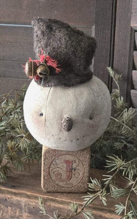 HolidayJingle is painted and distressed. He has glass bead eyes, pine cone nose and a wool hat adorned with rusty bells all atop an antique wood block. This snowman is approx. 7 1/2" tall x 4" wide. Thank you for stopping by! *Sold*