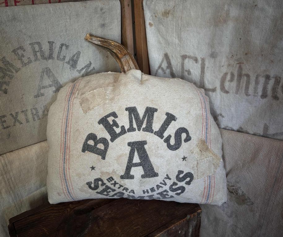 Sold. Made from a vintage grain sack. Rag stuffed with a real pumpkin stem. Measures 15”x15”. Please email to purchase amijones.folkart@gmail.com