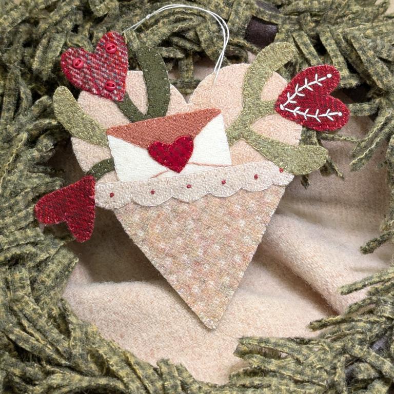 This wool appliqued ornament is made of overdyed wool with beautiful cotton back. Stitching is done with over dyed flosses. It measures approximately 5 1/4" x 5 1/4". Designed by Buttermilk Basin and stitched by me. As always the cost of postage is included if mailed within the connected 48 states. I may have more than one of this design so if you want multiples, just ask. Email me at mollyandpeewee@gmail.com with your choice of method of payment. I take PayPal, Venmo and Zelle. Thank you for looking. Debbie
