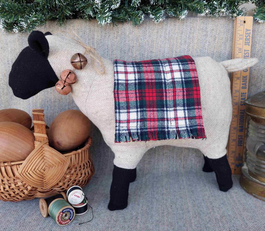 ~~~~THANK YOU--SOLD~~~~ A sweet little LIGHT TAN WOOL SHEEP made from DORR wool and stuffed with poly fiber. He stands by himself and would look stunning on your center dining table or on a mantle or side table. 3 rusty bells are tied around his neck and his plaid blanket is made from an old Pendleton wool skirt. I love to recycle wonderful wool fabrics when I can. TAN SHEEP measures 16 INCHES LONG BY 12 INCHES TALL . Not too small but table top perfect. KINDLY ASKING $39.00 with additional shipping of $5.95. (not suitable for a toy - decor only). Email me at VG004@COMCAST.NET to arrange payment for your purchase. Thanks so much for shopping with our group! ~~~~THANK YOU--SOLD~~~~