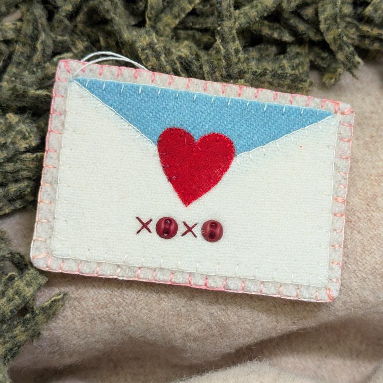 This wool appliqued ornament is made of overdyed wool with beautiful cotton back. Stitching is done with over dyed flosses. It measures approximately 2 1/2" x 3 1/2". Designed by Buttermilk Basin and stitched by me. As always the cost of postage is included if mailed within the connected 48 states. I may have more than one of this design so if you want multiples, just ask. Email me at mollyandpeewee@gmail.com with your choice of method of payment. I take PayPal, Venmo and Zelle. Thank you for looking. Debbie